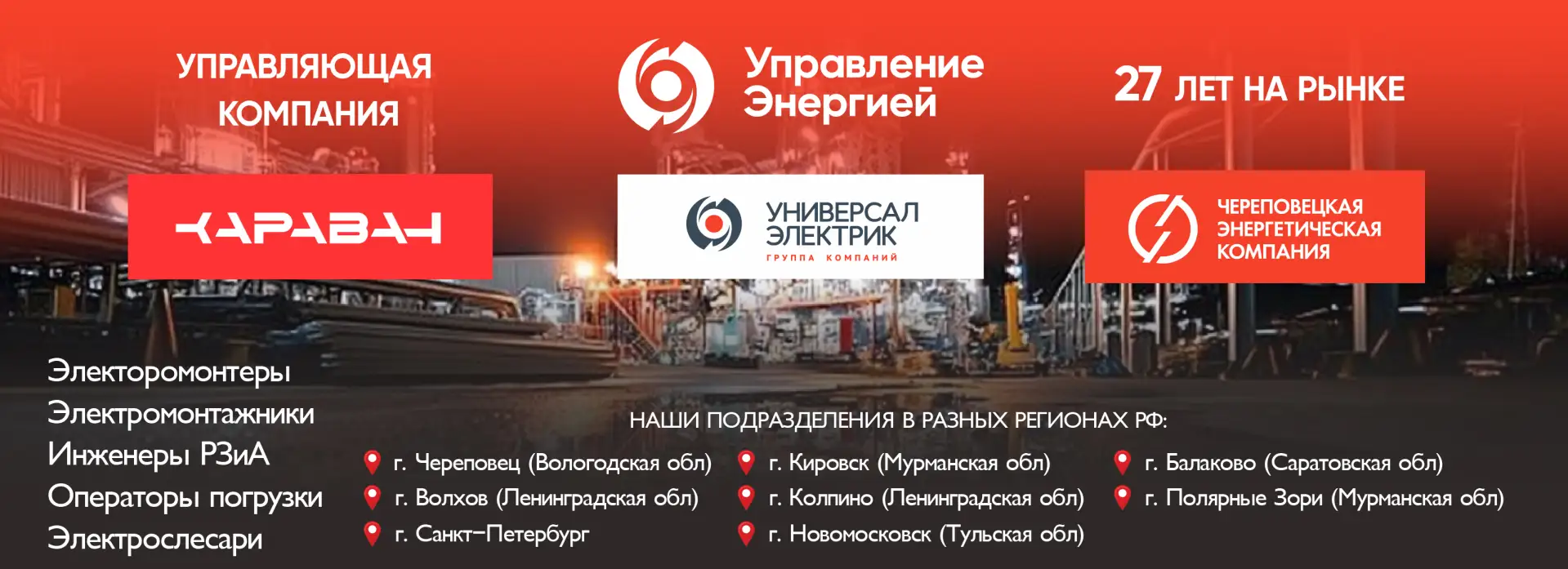 ООО «Управление энергией» — управляющая организация группы компаний «Универсал – Электрик», которая занимает ведущие позиции на рынке проектирования, капитального и энергетического строительства, сервисного обслуживания промышленных объектов и инфраструктуры. Уже более 25 лет мы успешно реализуем комплексные проекты «под ключ» на всей территории РФ и в странах ближнего зарубежья.